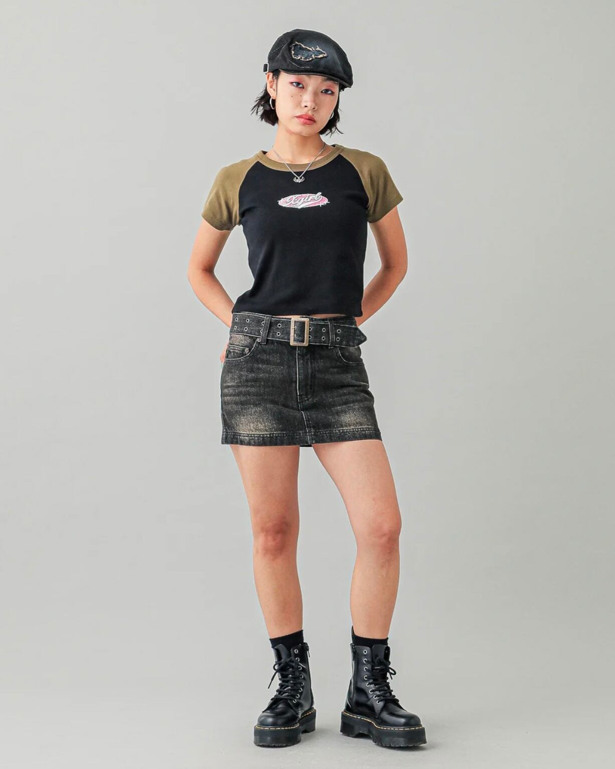 トレンドライクなちびTには、ミニスカートやレイヤードパンツと合わせてさらに旬な着こなしに。