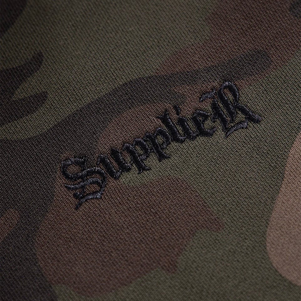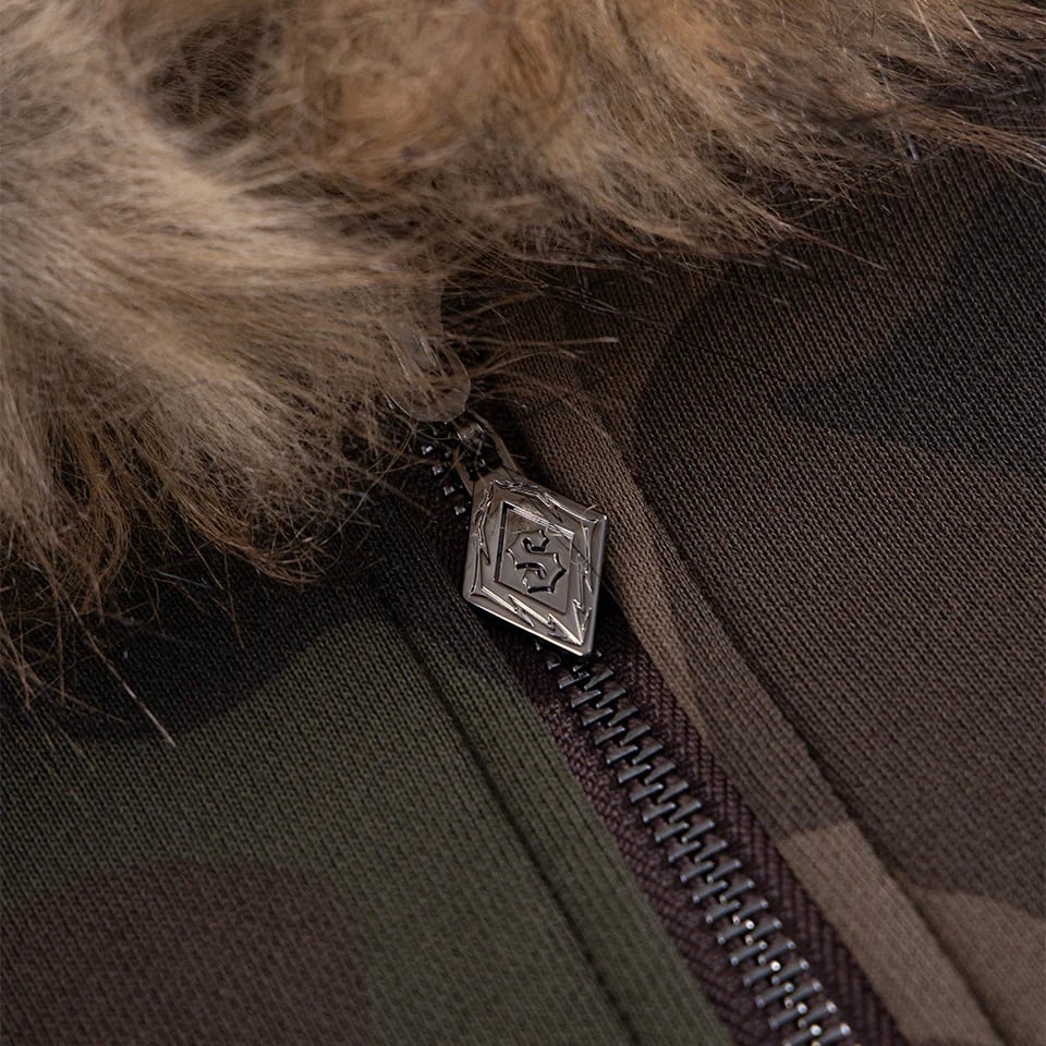 フードにフェイクファー生地を取り付けられています。SUPPLIERのシグネチャーデザインの一つである"CROSS LOGO"をラインストーンと刺繍の組み合わせで背面に施されています。