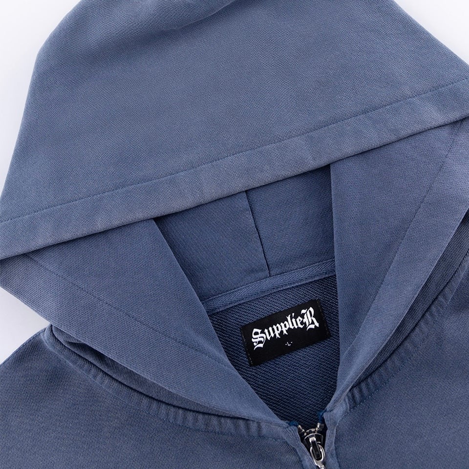380GSMの裏毛生地を採用したプルオーバーフーディ。 SUPPLIERのアイコンでもあるクロスモチーフを配色のラインストーンで要所に施しました。 左胸にはシンプルなブランドロゴを刺繍で配置。 今季より新しく設計された程よい短丈のボックスシルエットで仕上げました。