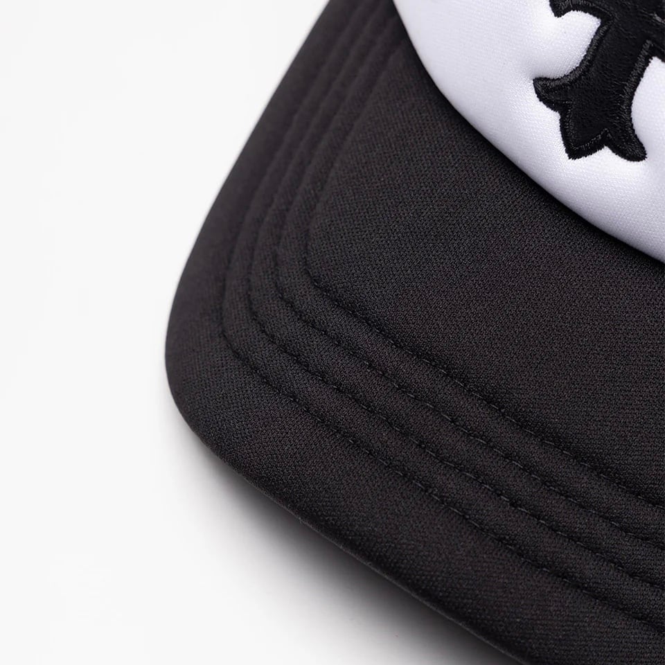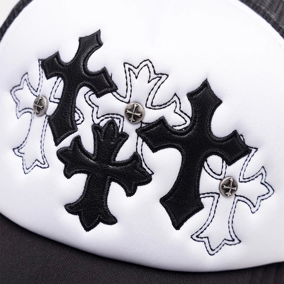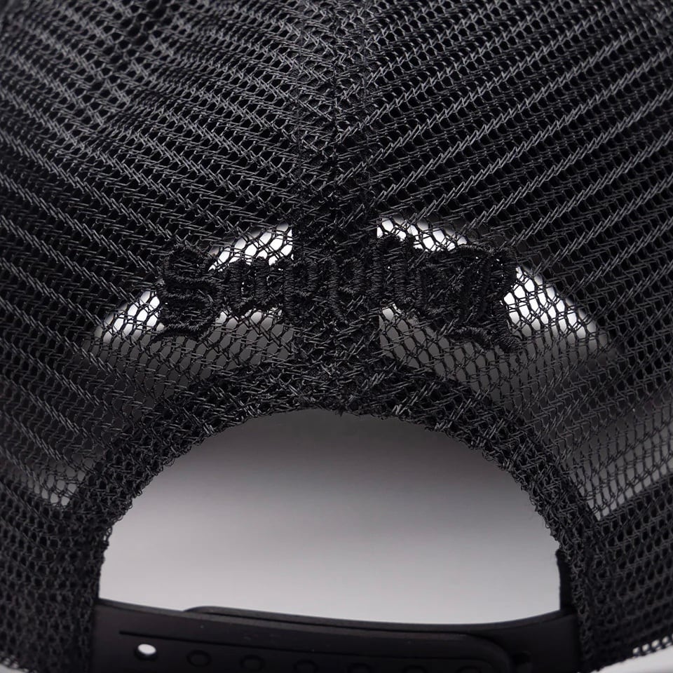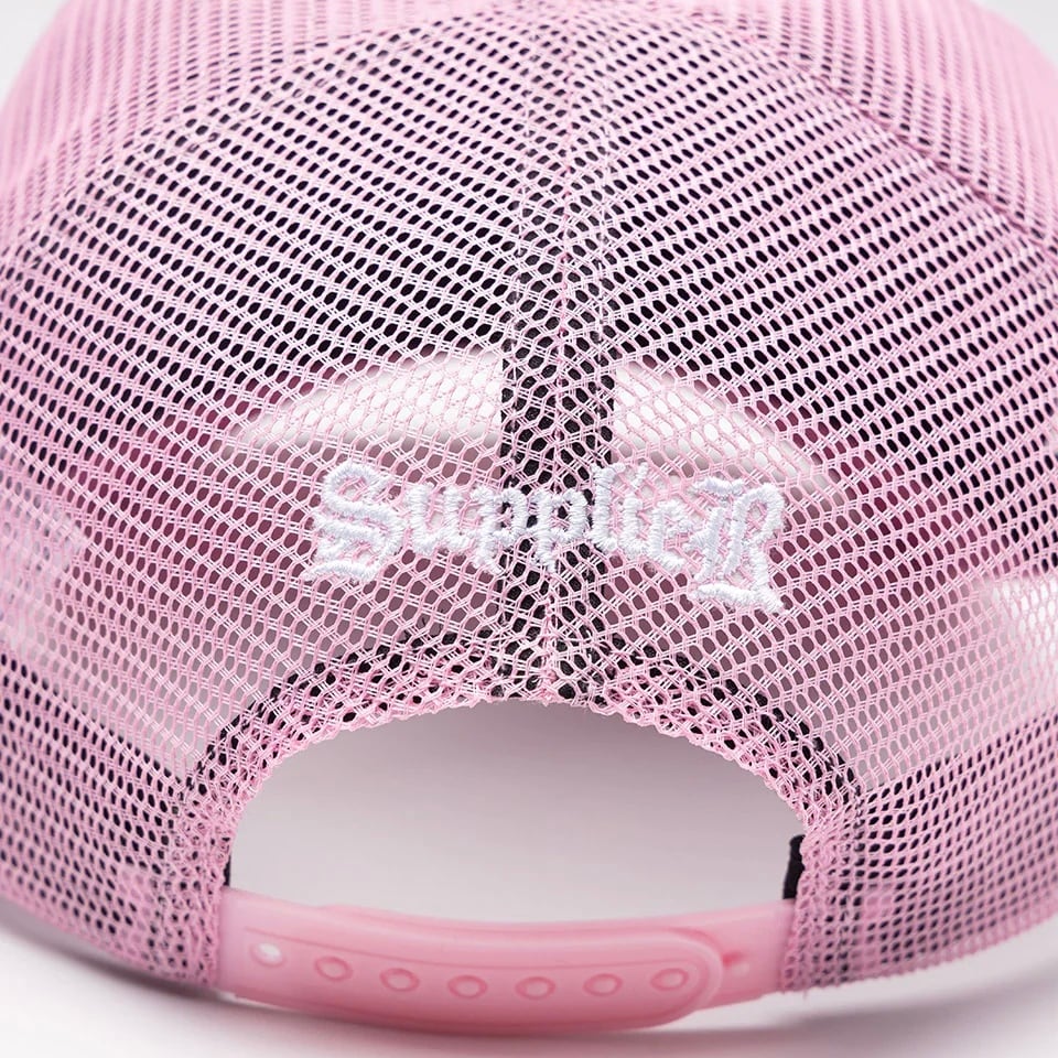 SUPPLIERのアイコンでもあるクロスモチーフを合皮とステッチ刺繍で施したメッシュキャップ。 背面のアジャスターの上にはブランドロゴを刺繍で配置。