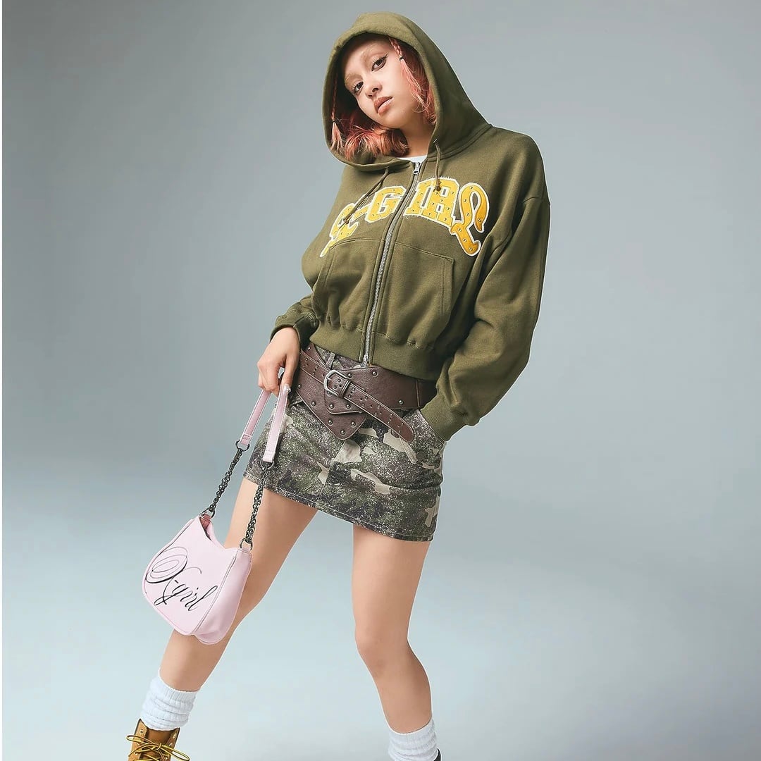 今シーズンは、トレンドのカモフラージュ柄スカートと合わせて、レディライクななY2Kコーデに。