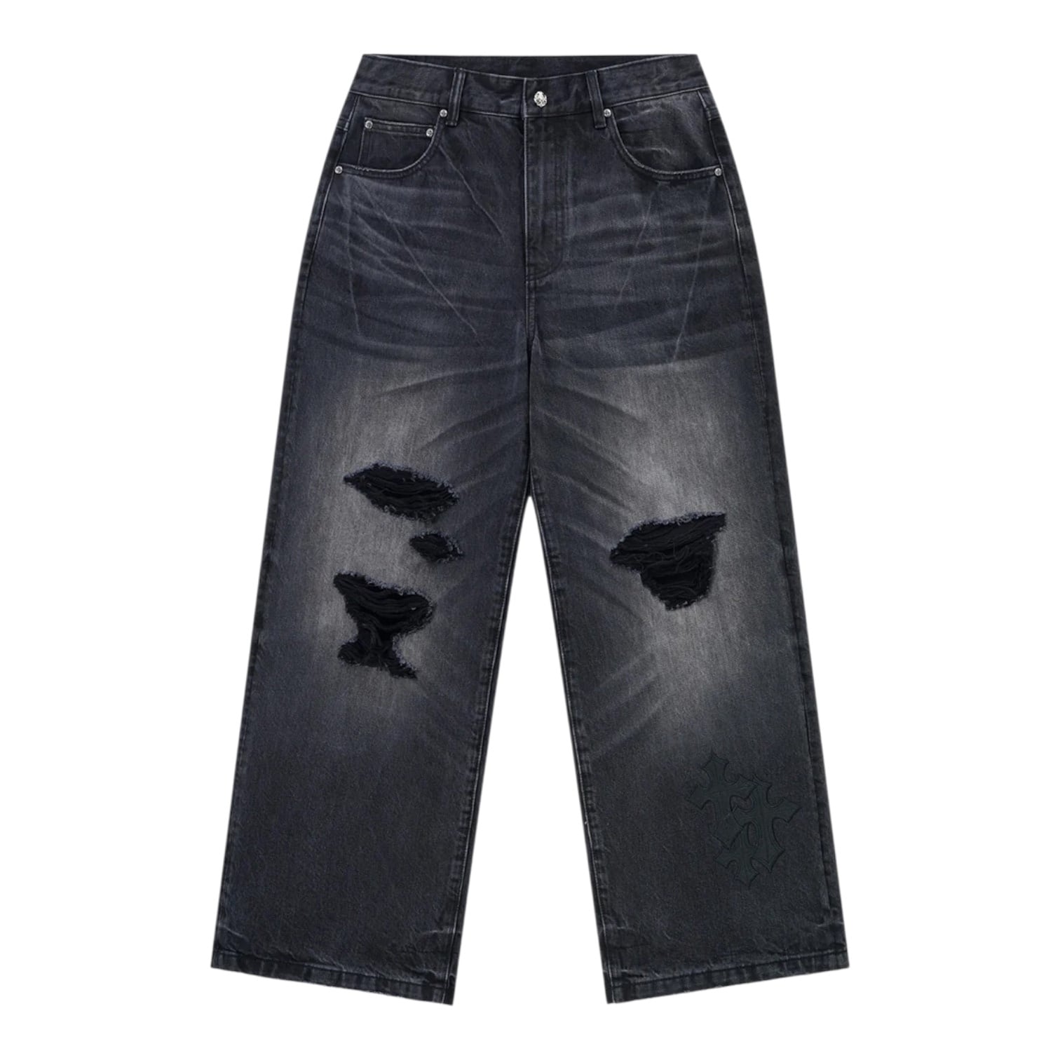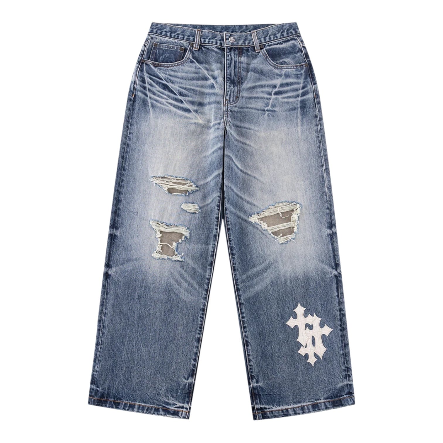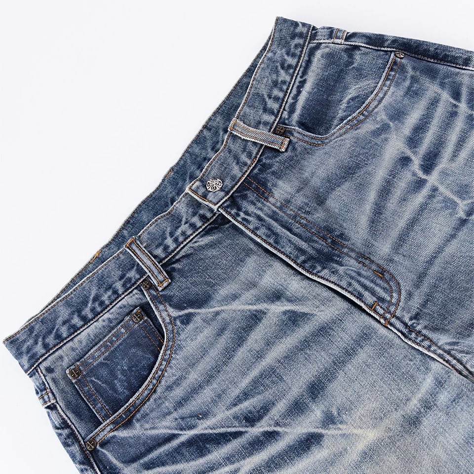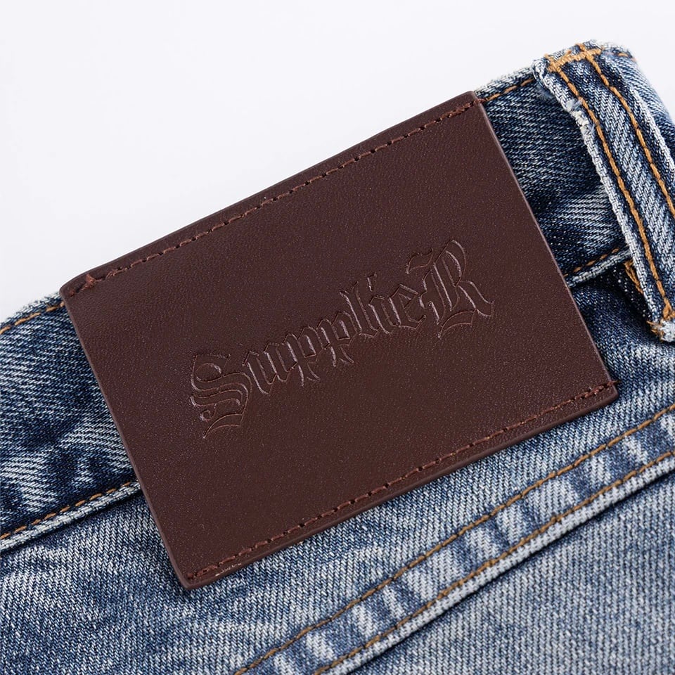 14ozの生地を採用したバギーデニムパンツ。 SUPPLIERのアイコンでもあるクロスモチーフの合皮を要所に刺繍で叩きつけました。 全体にウォッシュ加工とダメージを施し、ヴィンテージ調の風合いに仕上げています。 ルーズなシルエットで足元にボリュームの出る設計になっています。