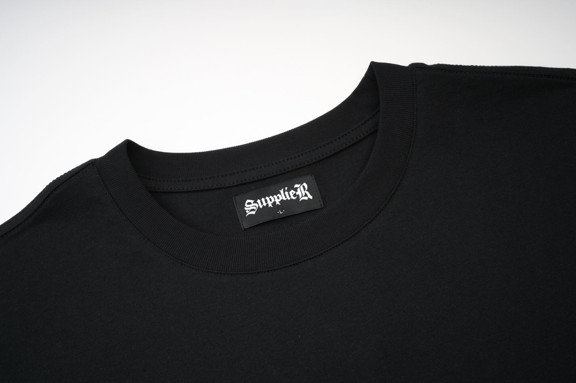 SUPPLIERのシグネチャーデザインの一つである"CROSS LOGO"をラインストーンとプリントの組み合わせで背面に施しました。